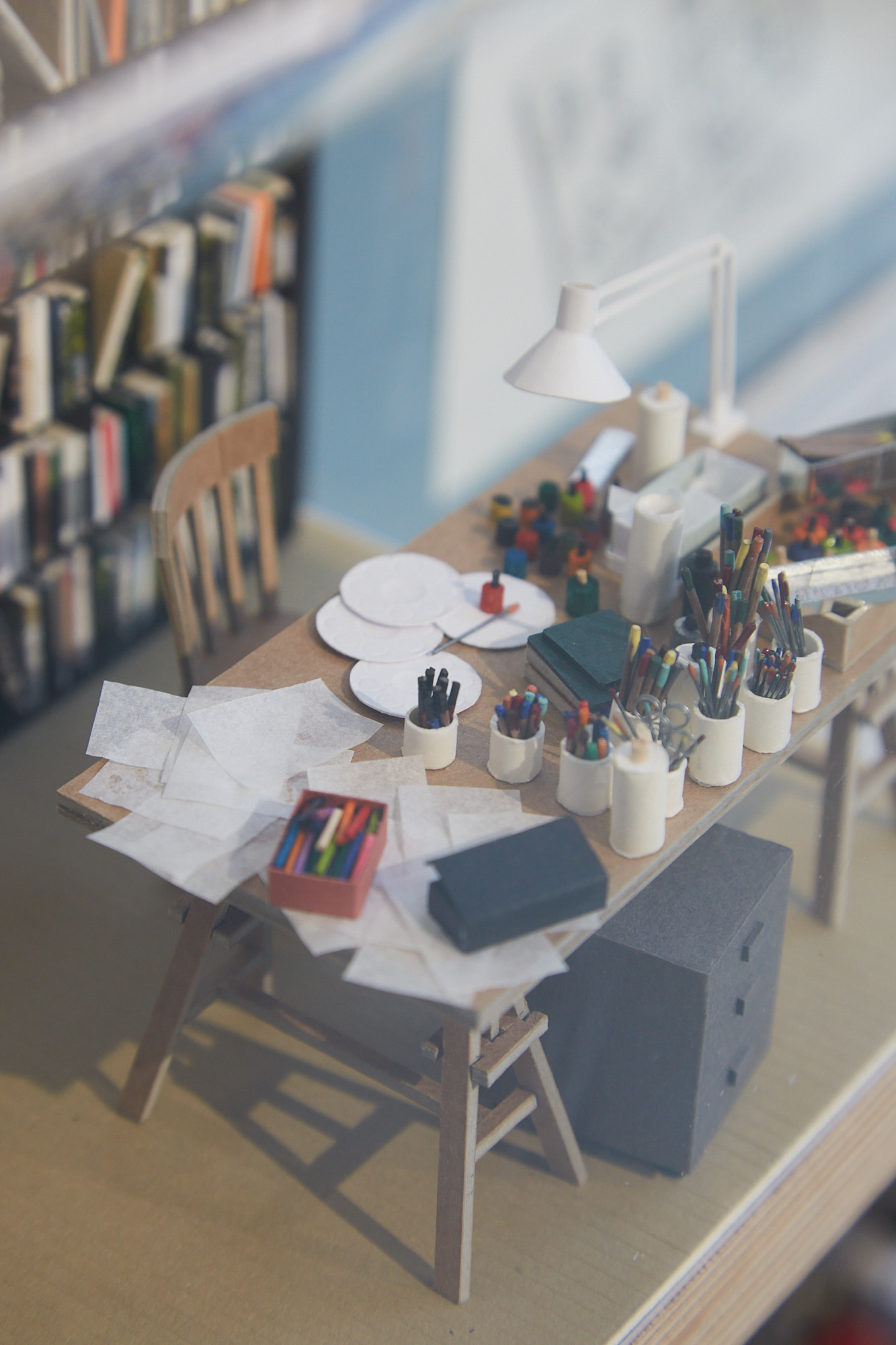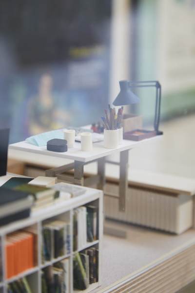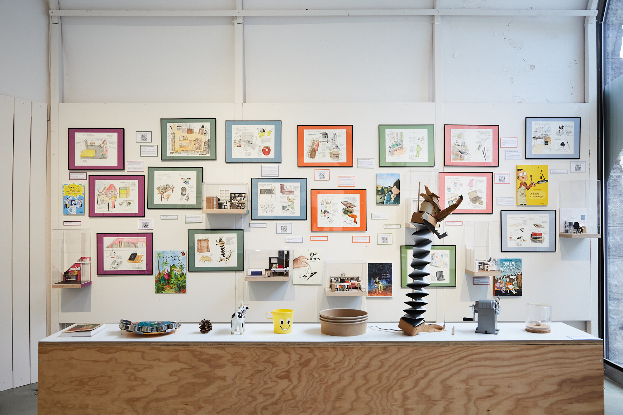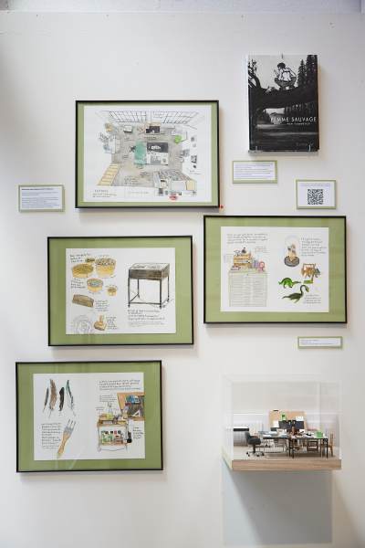 Dora nous raconte : « L’exposition est un prolongement de ma BD publiée en 2025 chez Helvetiq, intitulée « Certifié Humain ». Dans mon ouvrage, je me questionne sur l’arrivée de l’Intelligence Artificielle générative dans le monde des dessinateurs et dessinatrices et je décide de partir à leur rencontre en Europe. Nous retrouverons dans cette exposition Guillaume Long, Camille Jourdy, Tom Tirabosco, Léonie Bischoff, Franny Dreyer, Lauraine Meyer, Rylsee, Bianca Schaalburg, Barbara Yelin et Martin Panchaud. Ce faisant, je documente chacun de leur atelier à travers mes dessins à l’aquarelle. On y découvre les dessins originaux que j’ai réalisés dans chaque atelier mais aussi des reproductions miniatures au 1/15ème réalisées par deux maquettistes, Agathe Mignon et Camille Fauvel. Une présentation des dessinatrices et dessinateurs, des QRcodes pour écouter chaque entretien réalisé avec chaque artiste, ainsi d’un livre représentatif de leur travail complètent le tableau. »